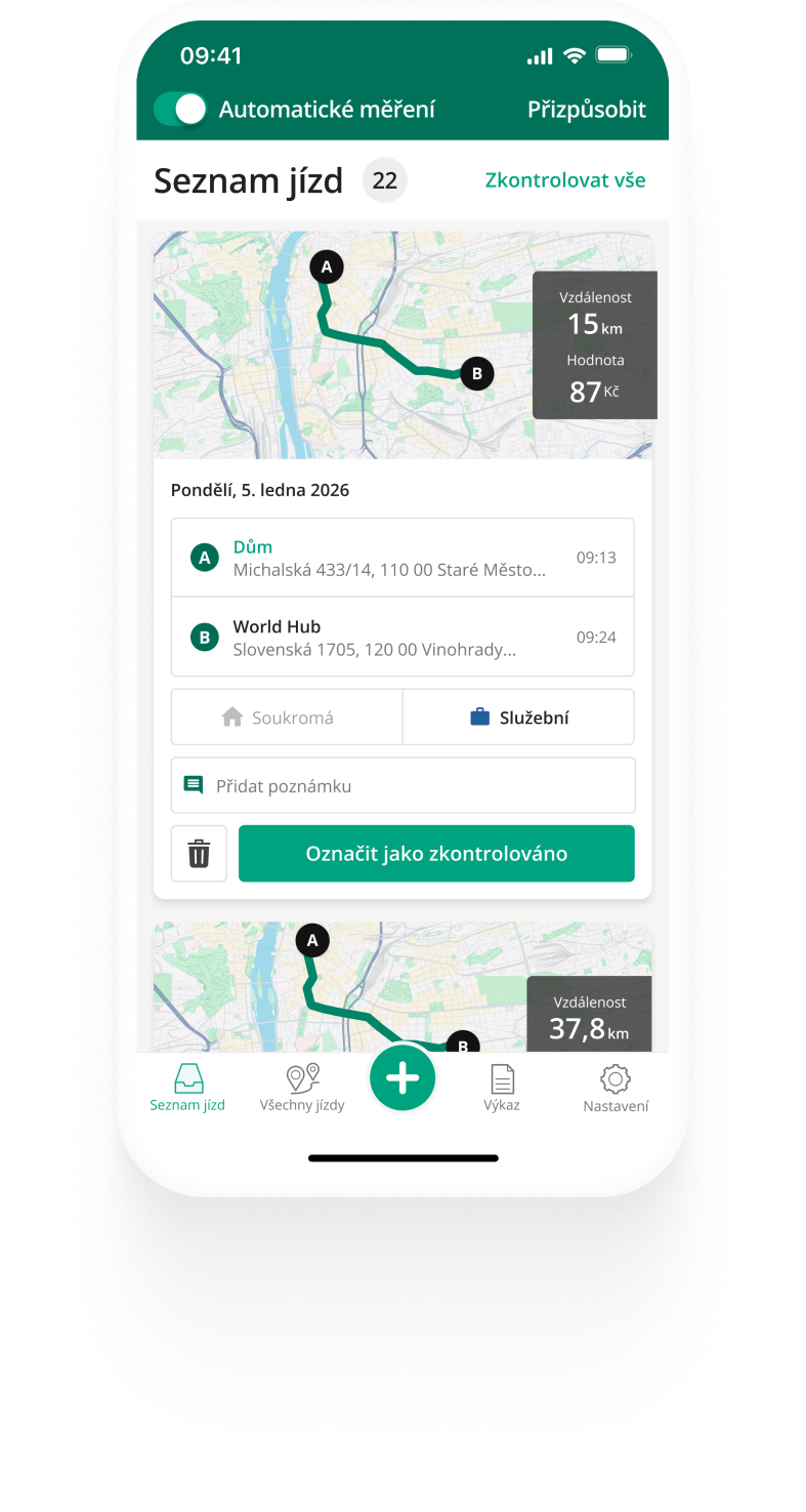 Zadávejte jízdy ručně a výpočet vzdálenosti nechte na nás.